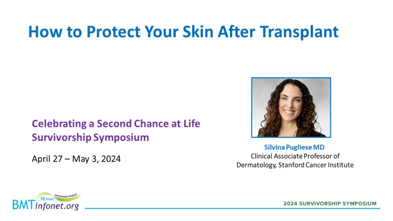 (00:08): It is my pleasure to introduce today's speaker, Dr. Silvina Pugliese. Dr. Pugliese is Clinical Associate Professor of Dermatology and Attending Physician at Stanford Hospitals and Clinics and the Stanford Cancer Institute. She specializes in the management of skin complications associated with chemotherapy, radiation therapy and bone marrow transplantation (BMT) with an emphasis on graft-versus-host disease (GVHD) and survivorship. Please join me in welcoming Dr. Pugliese.