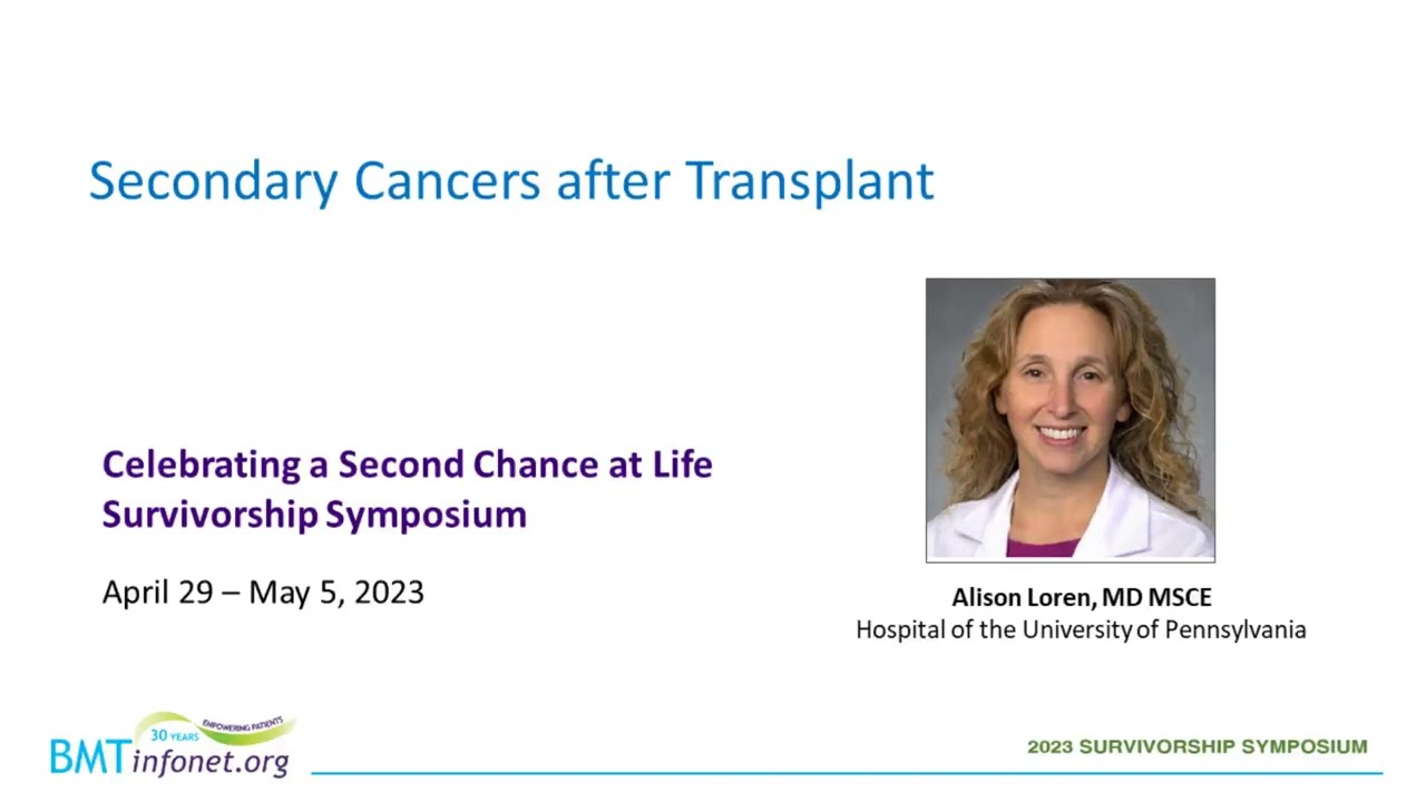Bone marrow transplant survivors have an increased risk of developing a second or “secondary” cancer later in life. This video discusses risk factors for developing a secondary cancer, cancers most frequently seen after transplant and monitoring and testing that should be done periodically to catch second cancers early when they are easiest to treat. (Throughout the talk, bone marrow transplant refers both to bone marrow transplants and stem cell transplants, as well as cord blood transplants.)
