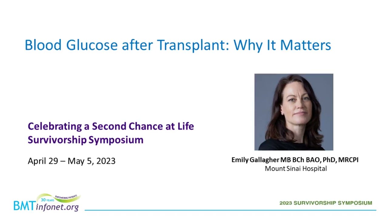 (00:51): [Dr. Emily Gallagher]: Thank you, Marla. And thank you, BMT InfoNet, for inviting me to present today. I'm going to present on blood glucose after transplant and why it matters.